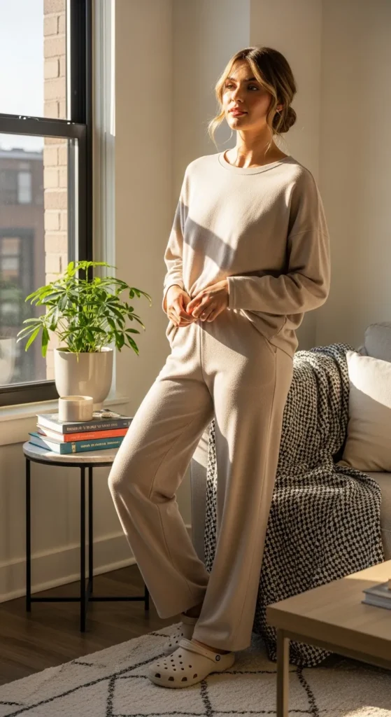 A soft matching lounge set instantly elevates Crocs into cozy-chic territory. The coordinated fabric gives a polished feel while still staying relaxed enough for home days or quick errands outside.