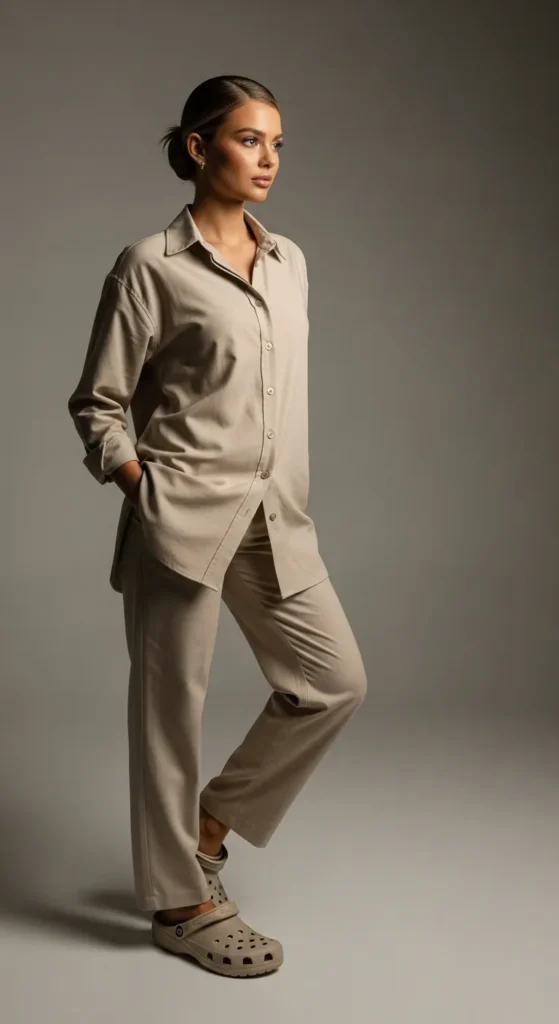 A full neutral-toned outfit with Crocs creates a clean, minimal aesthetic. This look feels calm, modern, and very Pinterest-worthy for everyday styling.