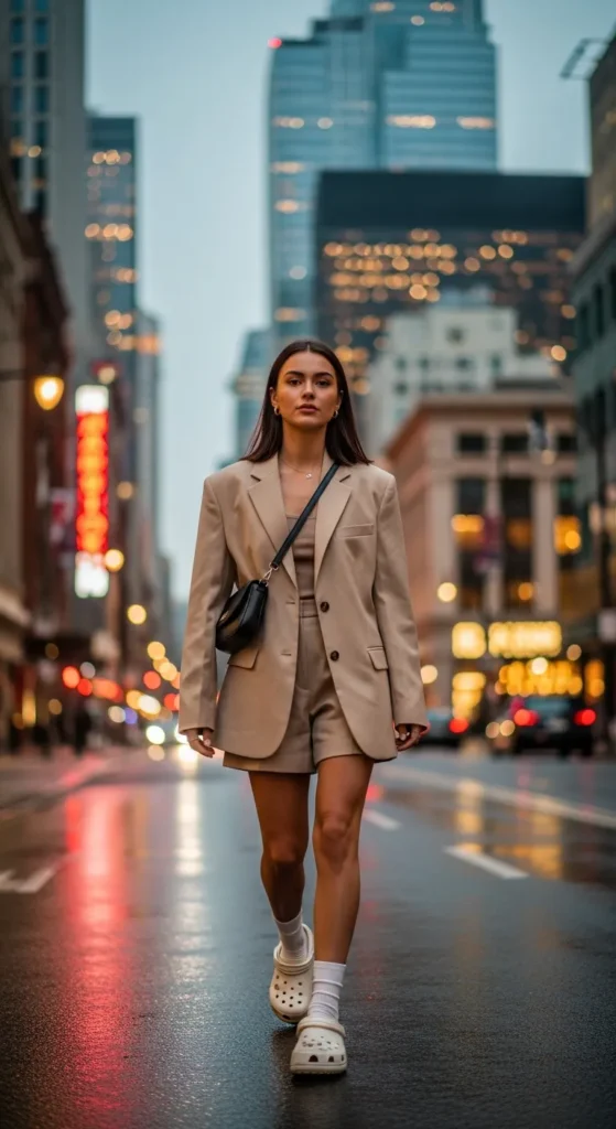 An oversized blazer paired with shorts creates a chic contrast when styled with Crocs. It’s a modern street-fashion look with relaxed sophistication.
