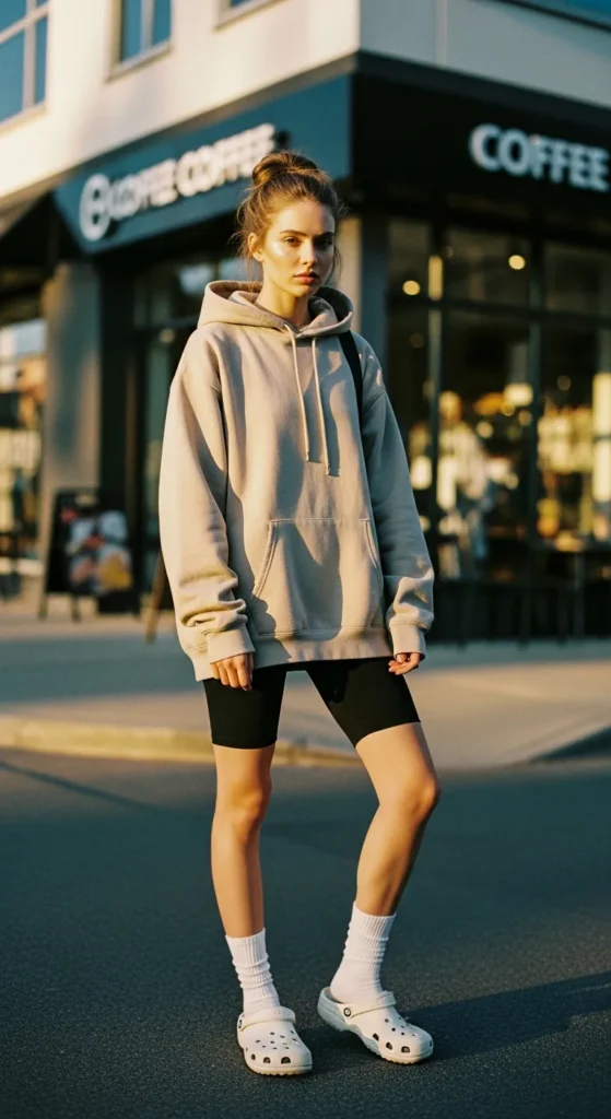 A relaxed oversized hoodie paired with fitted bike shorts creates that effortless off-duty look. Add Crocs for a comfy street-style balance that feels laid-back but still intentional, perfect for coffee runs or casual grocery trips.