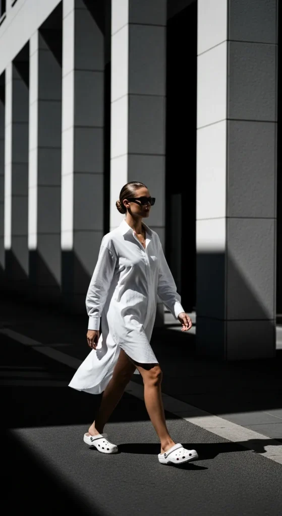 An oversized shirt dress styled with Crocs gives a clean, airy aesthetic. It’s ideal for hot days when comfort is key.