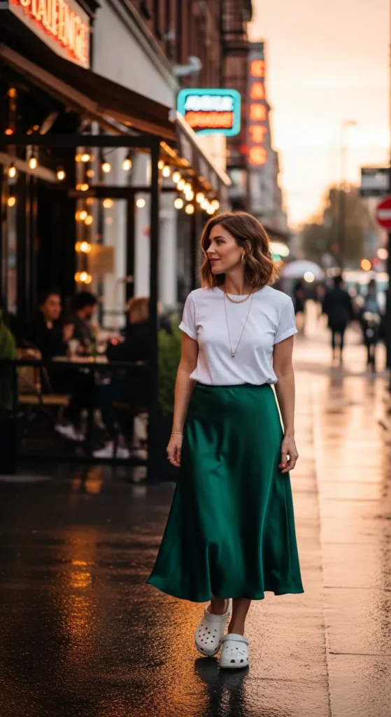 A satin skirt paired with a simple tee creates a soft contrast when grounded by Crocs. It’s casual elegance at its best.