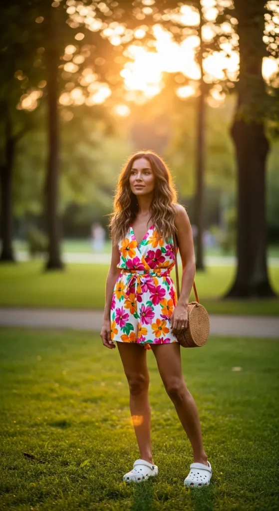 A lightweight romper styled with Crocs feels playful and easygoing. This outfit is ideal for warm weather days and casual outdoor strolls.