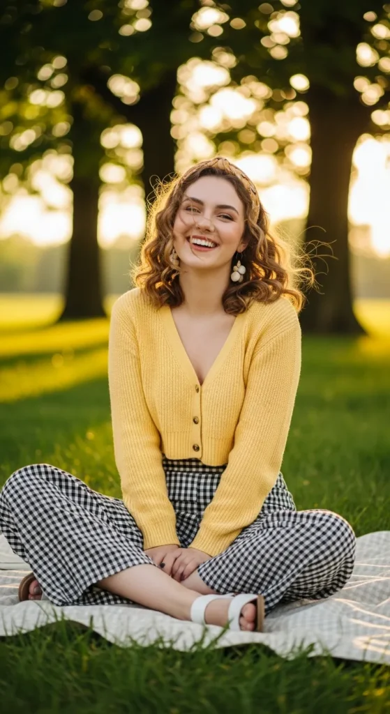 A butter yellow cropped cardigan paired with black-and-white gingham pants feels cheerful yet grounded. It’s ideal for summer picnics or weekend markets.