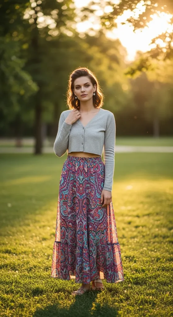 A light gray cropped cardigan over a bold printed maxi skirt balances statement patterns with soft neutrals. It’s comfortable and expressive without feeling overwhelming.