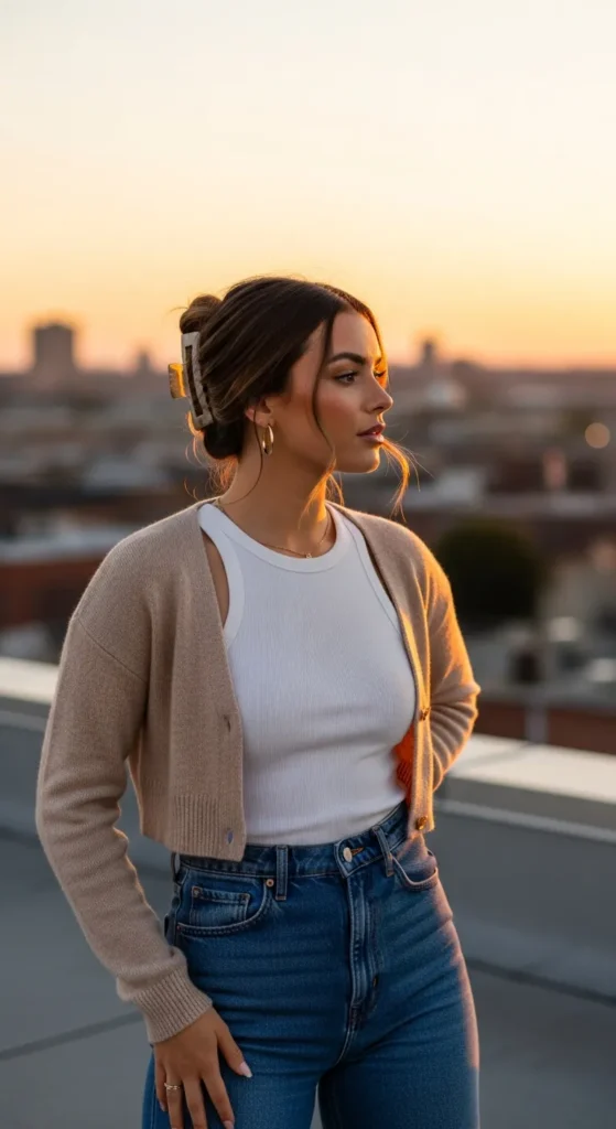 A soft beige cropped cardigan layered over a ribbed tank and classic mom jeans feels cozy yet cool. It’s perfect for transitional summer evenings when you want comfort without sacrificing style.