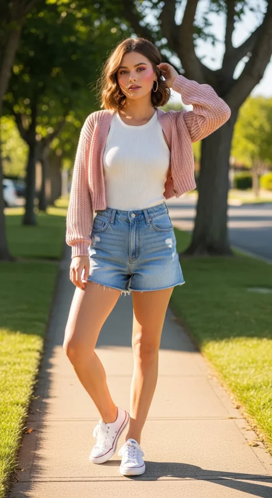 A blush cropped cardigan layered over a simple white tank and high-waisted denim shorts creates an easy, flirty summer look. It’s sweet without trying too hard and perfect for casual brunches or weekend errands.