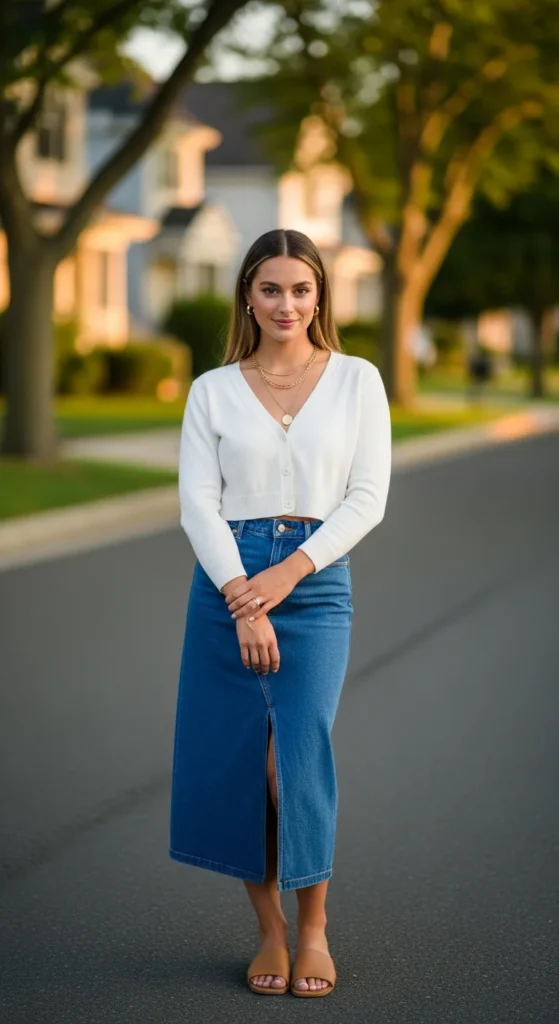 A crisp white cropped cardigan with a classic denim midi skirt feels timeless. It’s understated, chic, and easy to style for everyday summer routines.