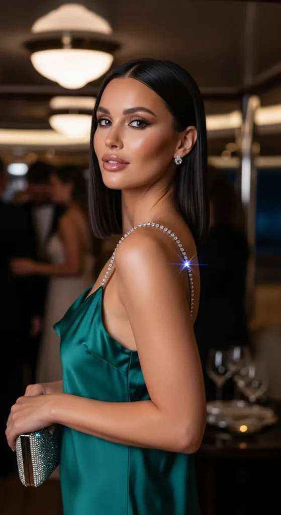A simple slip dress elevated with crystal straps adds subtle glamour. It’s minimal yet striking, perfect for those who love understated elegance.