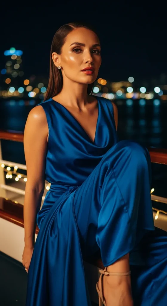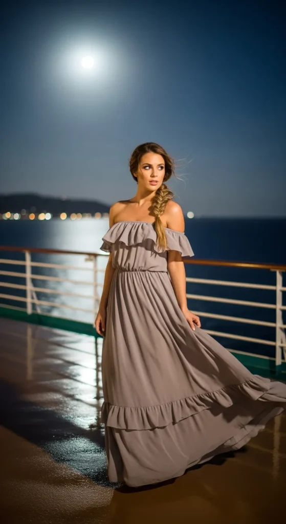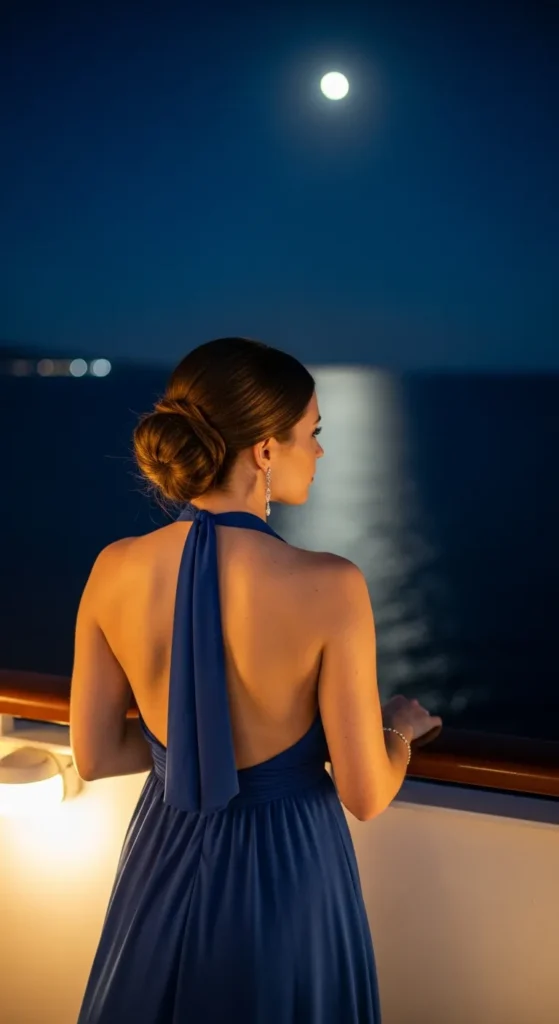 A halter neck dress with an open back feels bold yet elegant, perfect for warm cruise nights. It highlights your shoulders and adds a touch of allure.