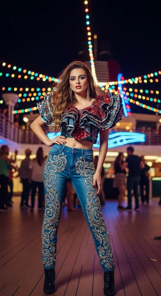 A bold embellished denim paired with a dramatic top feels fun, modern, and approachable. It’s perfect for a laid-back yet glam cruise party night.