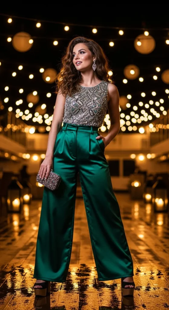 Flowy wide-leg pants paired with a beaded top create a perfect balance of comfort and sparkle. It’s ideal for long nights without compromising style.