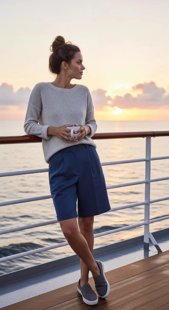Nothing feels more cruise-perfect than a breathable linen shirt tucked into tailored high-waist shorts. It’s relaxed yet refined, perfect for strolling the deck or grabbing brunch with ocean views.