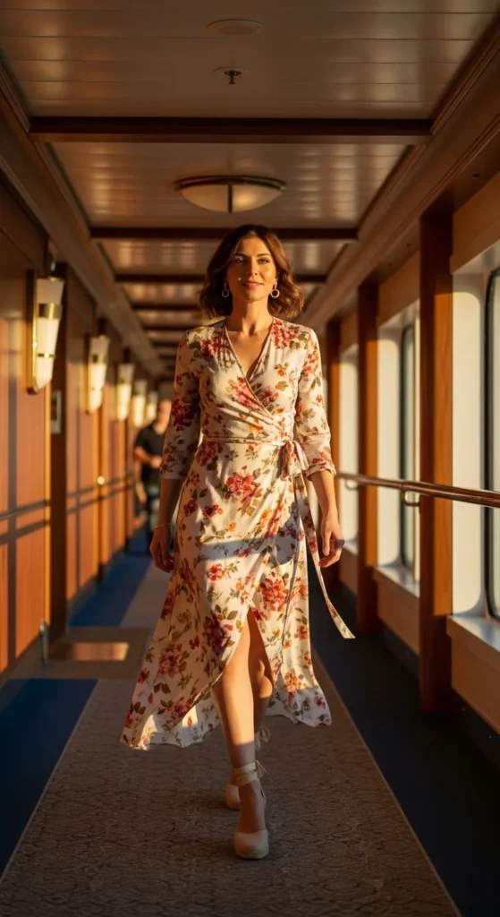 A wrap dress is timeless and flattering, hugging the body in all the right places while staying easy to wear. Perfect for both daytime exploring and casual dinners onboard.