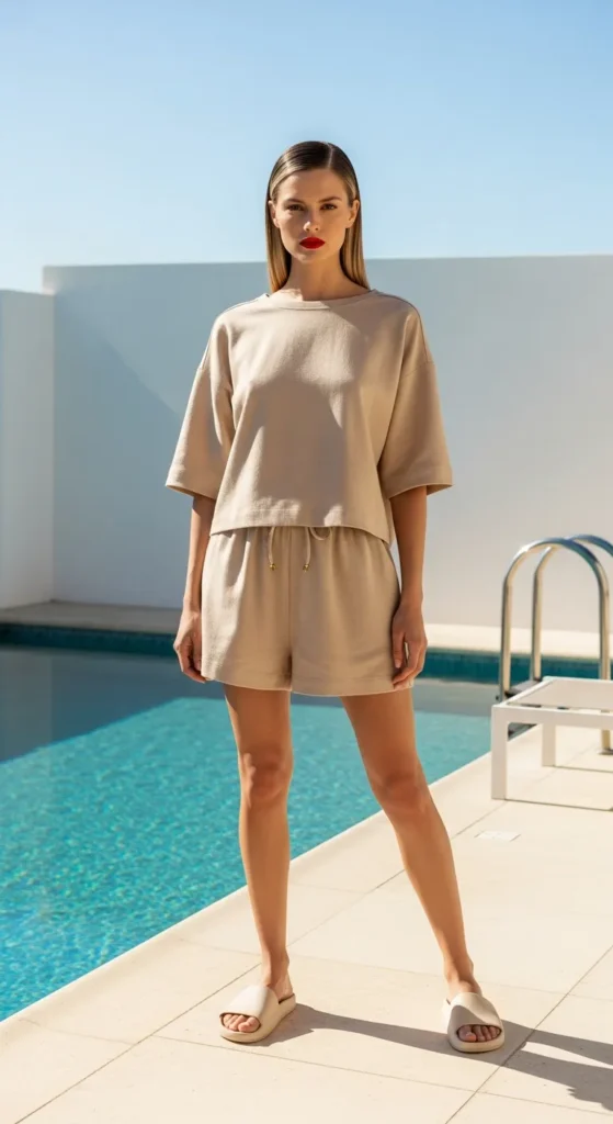 Matching sets feel intentional and effortless at the same time. A neutral co-ord set gives a cohesive look that’s easy to style and perfect for vacation photos.
