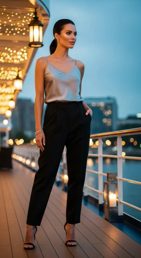 A silk camisole paired with relaxed trousers creates a soft, luxurious vibe without being overly formal.