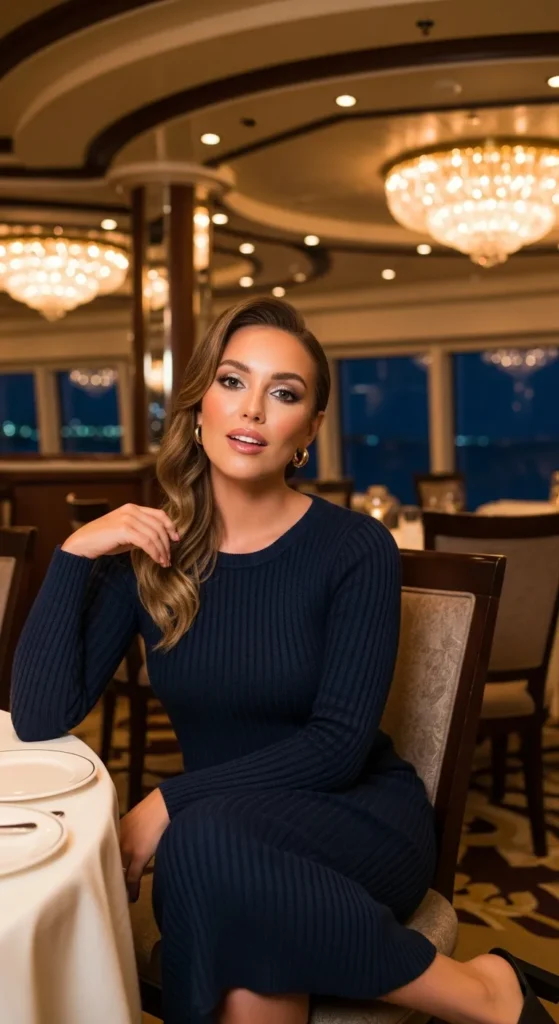 A lightweight knit co-ord set feels like loungewear but looks incredibly polished. The matching top and wide-leg pants create a streamlined appearance perfect for sea days or casual dinners onboard.