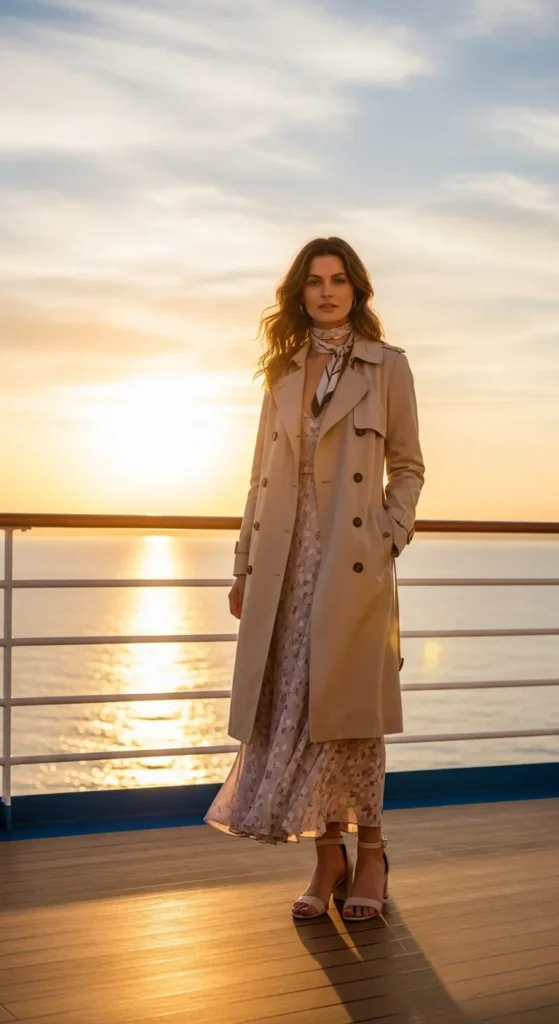 Layering a lightweight trench over a breezy summer dress creates dimension and elegance, especially for cooler evenings on deck. The structured outer layer balances the softness underneath.