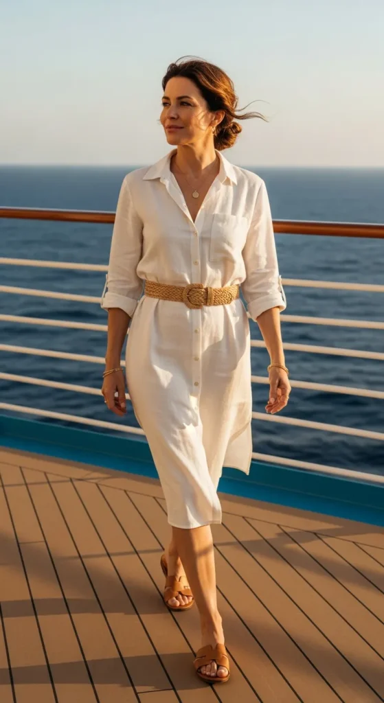 A crisp linen shirt dress paired with a woven belt creates a relaxed yet refined silhouette. The breathable fabric keeps you cool while the cinched waist subtly enhances your shape for an easy, elegant daytime cruise look.