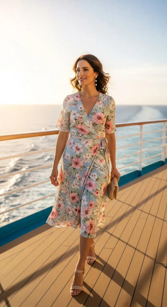 Stylist Suggestion: Choose block-heel sandals and pearl studs. The heels give stability on deck, while pearls enhance the timeless elegance of the wrap silhouette without overpowering it.