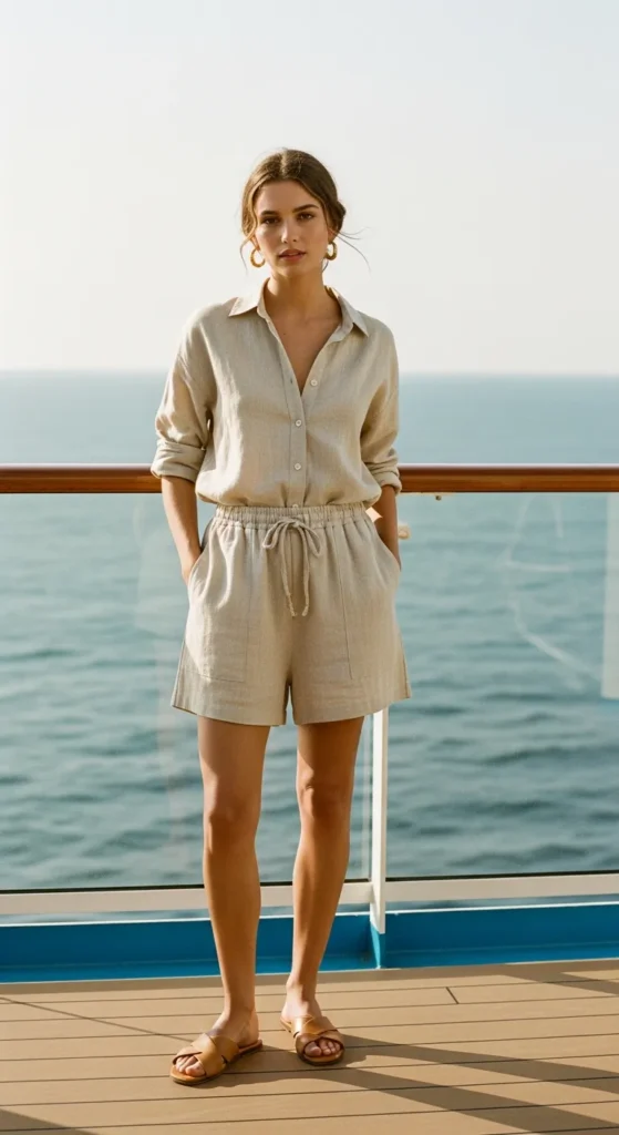 A relaxed linen button up paired with matching shorts feels naturally cool on deck. It moves with the breeze, keeps things breathable, and looks polished enough for casual lunches without trying too hard.