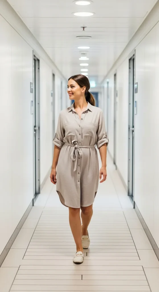 A shirt dress feels effortless and adaptable. Rolled sleeves add ease, while the structured shape keeps it from feeling too casual for shared cruise spaces.