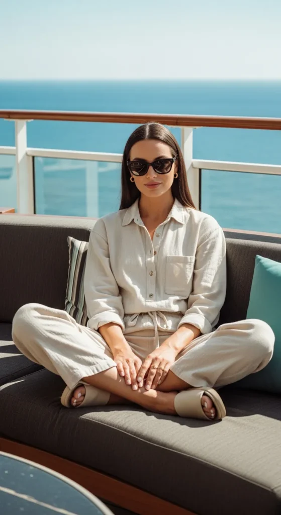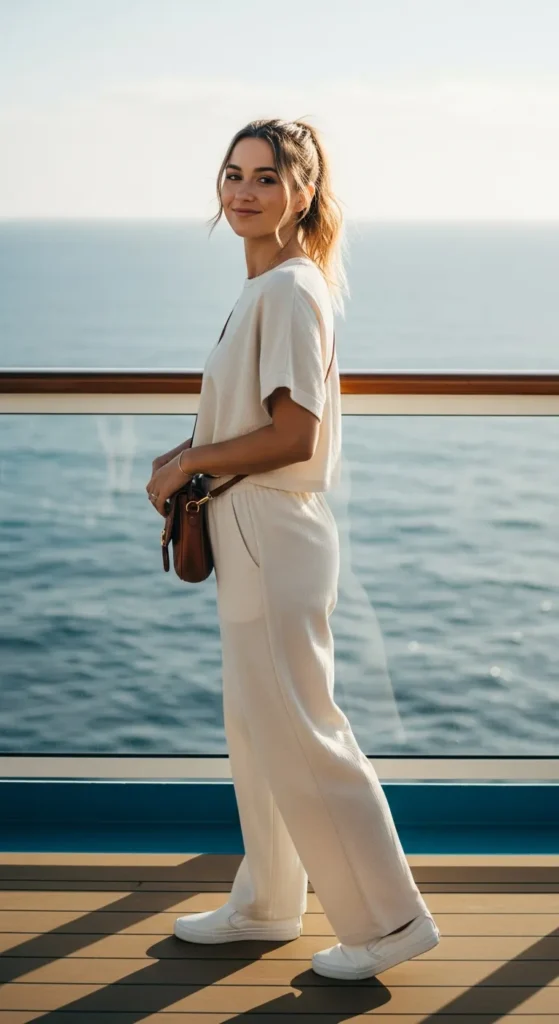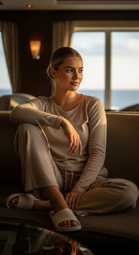 A comfortable lounge set feels right for sea days when time slows down. It’s cozy without looking like sleepwear, perfect for relaxed moments.