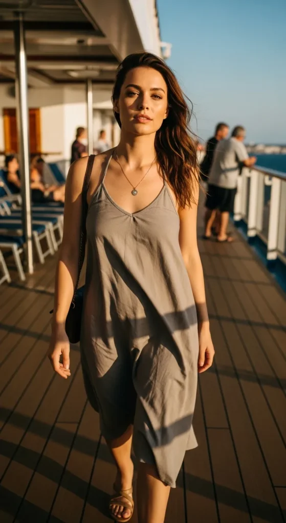 A soft jumpsuit feels like an all in one solution. Adjustable straps make it practical, while the fluid shape keeps it comfortable during long cruise days.
