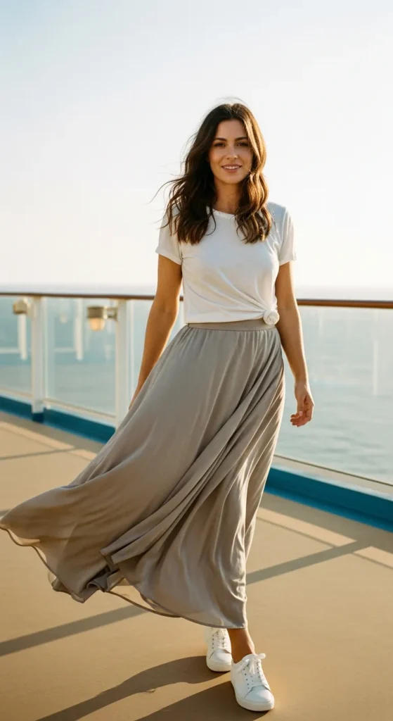 A flowy midi dress with gentle prints feels romantic without being dramatic. It sways with every step, making it perfect for walking the ship or watching the horizon slowly stretch ahead.