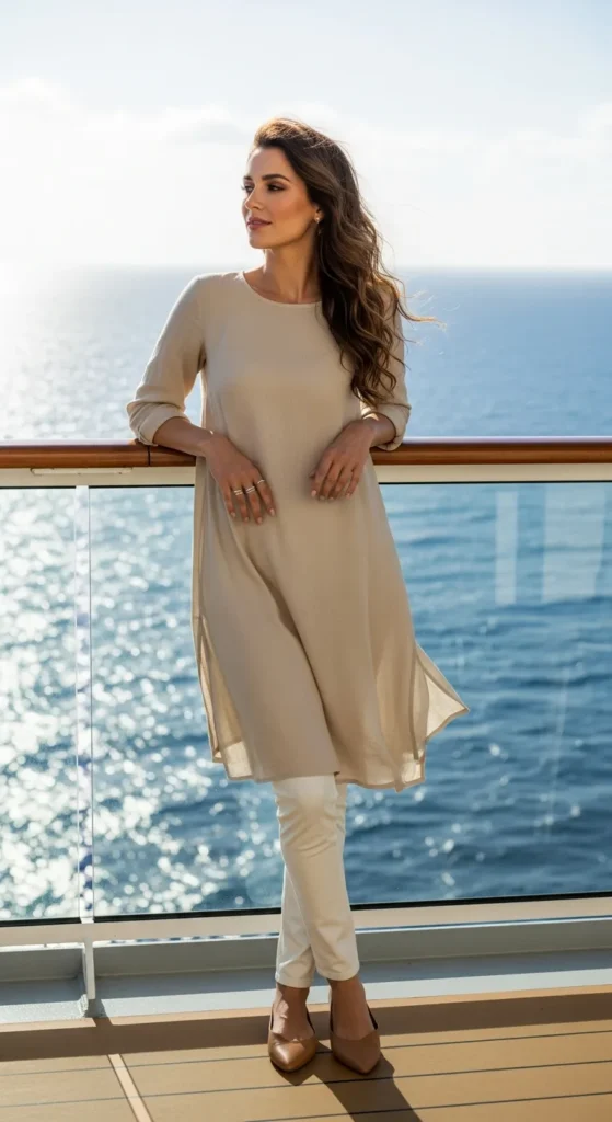 A loose tunic paired with slim pants creates balance. It feels airy on top while staying structured below, making it ideal for breezy decks.