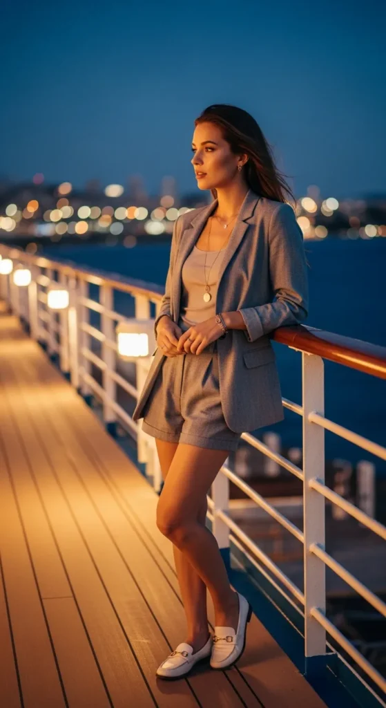 Stylist Suggestion: Roll the blazer sleeves and wear loafers. This softens the structure, making the outfit feel cruise appropriate rather than corporate.