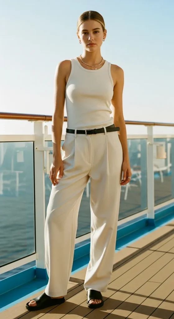 Palazzo pants move beautifully in the sea breeze. Paired with a simple tank, the outfit feels fluid, calm, and perfectly suited for slow paced cruise days.