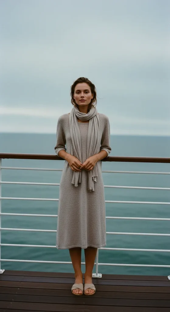A breathable knit dress hugs gently without feeling restrictive. It’s cozy enough for breezy decks yet light enough for warm afternoons, making it a quiet cruise essential.