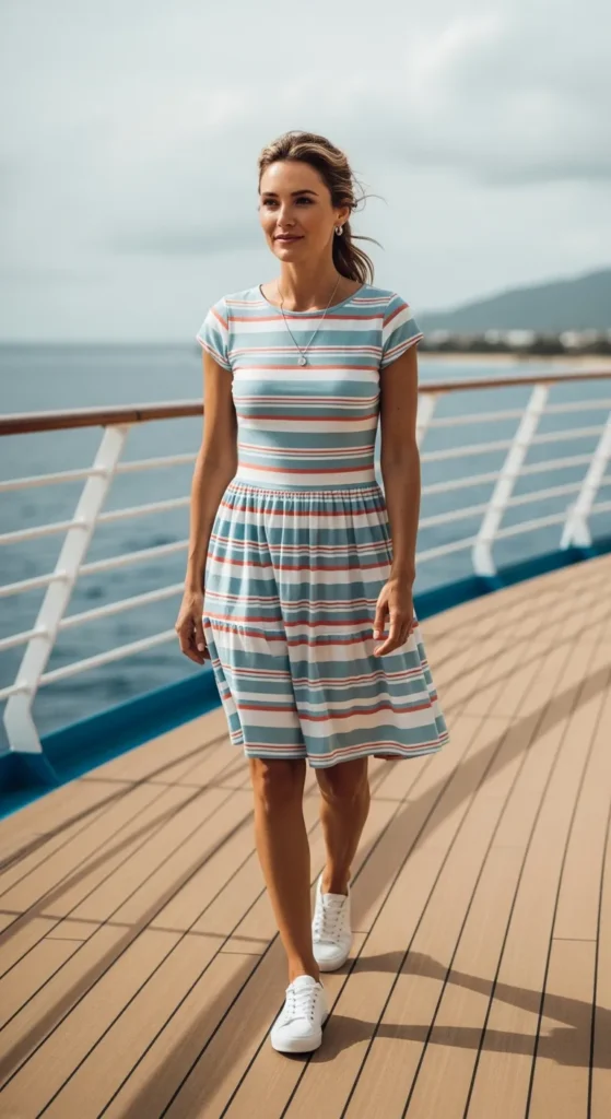 A soft striped dress feels classic and calming. It fits naturally into cruise scenery without overpowering the relaxed environment.