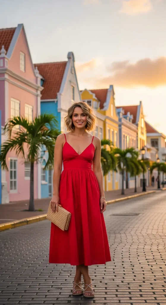 A bright red midi sundress stands out beautifully against Curaçao’s pastel backdrops.