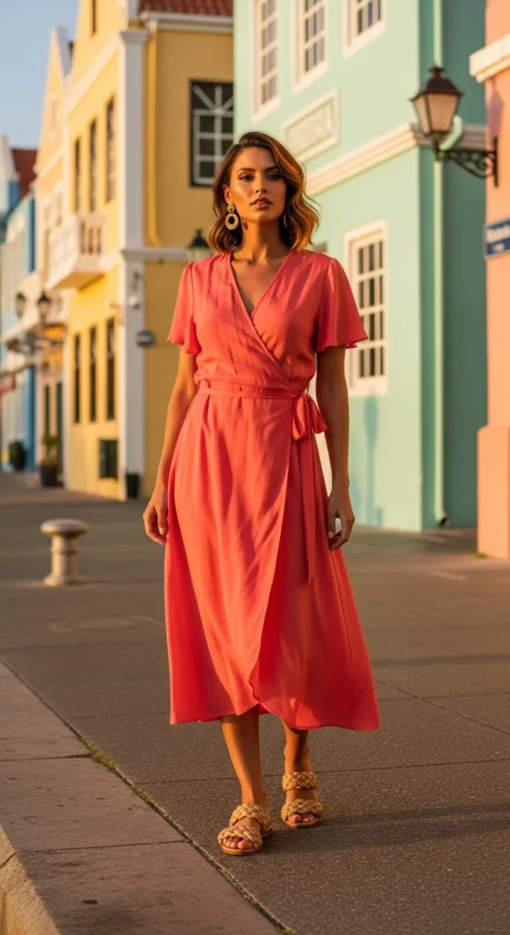 A coral-toned wrap dress with soft flutter sleeves feels perfectly in tune with Curaçao’s colorful skyline. The flowy silhouette catches the island breeze, making you feel light, feminine, and ready for waterfront strolls.