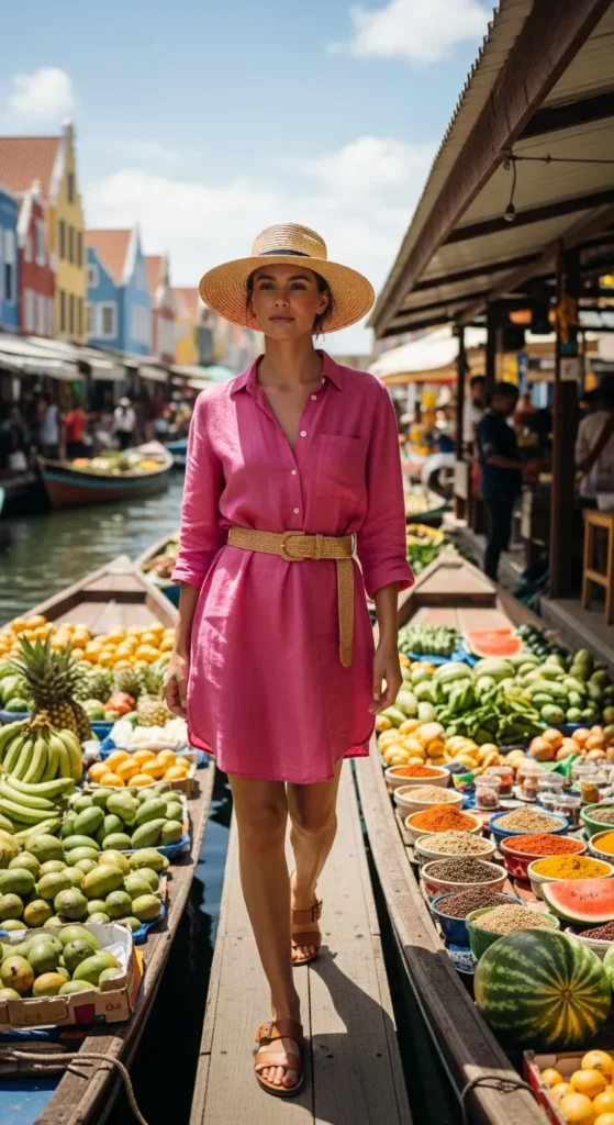 A relaxed pink linen shirt dress is breathable and chic, perfect for museum visits or market strolls.