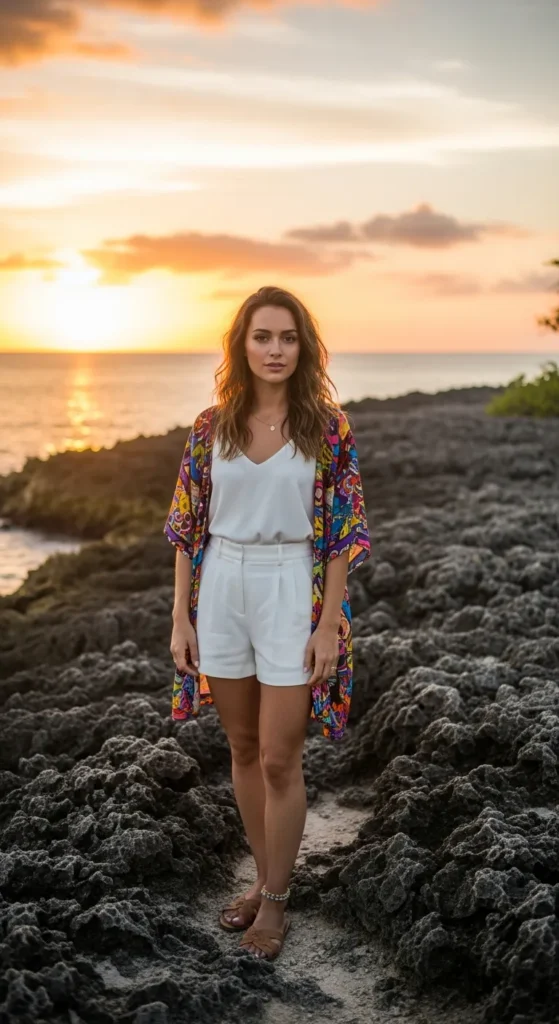 A lightweight printed kimono layered over a simple white tank and white shorts creates movement and drama without heat.