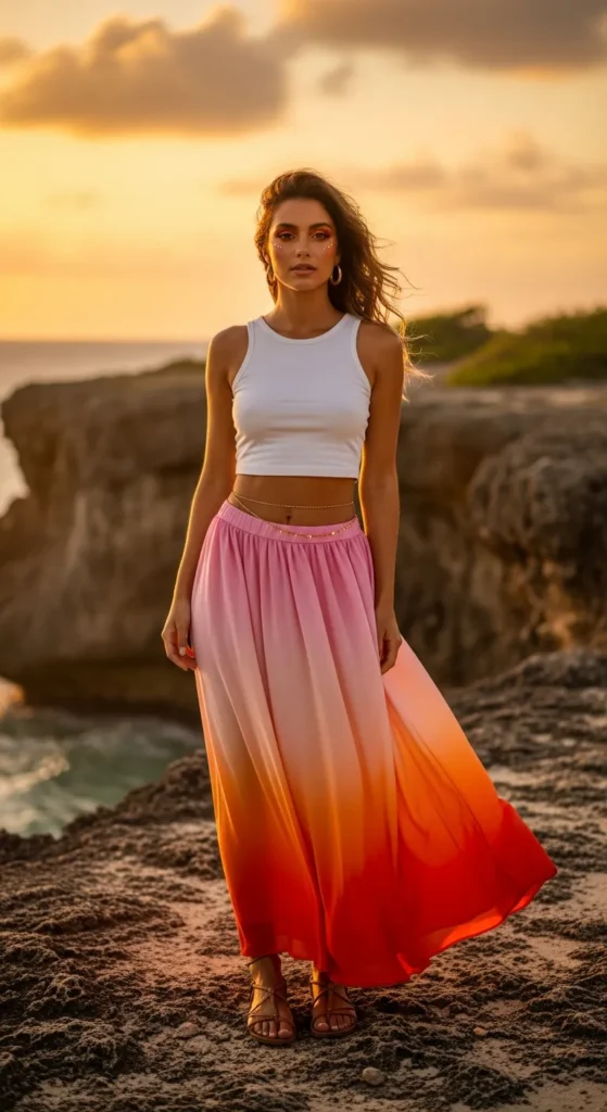 A flowy maxi skirt fading from pink to orange mimics a Caribbean sunset. Paired with a simple white cropped tank, the outfit feels romantic without trying too hard.