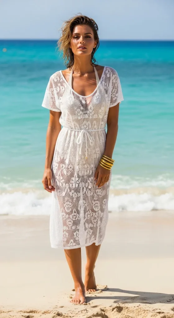 A white crochet midi cover-up over a neutral swimsuit feels dreamy for beach club afternoons.