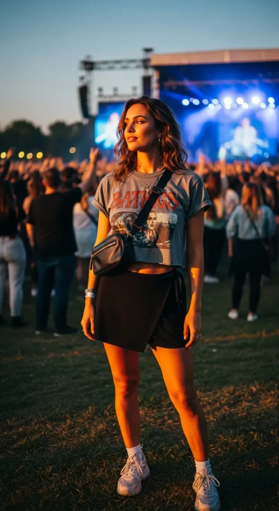 A cropped graphic tee paired with a wrap skirt mixes casual cool with flirty movement, creating a look that feels fun, expressive, and effortlessly stylish in any concert crowd.