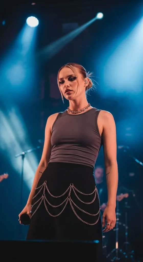 A fitted tank paired with a chain detailed skirt feels sexy and confident, using accessories to elevate a simple base into a head-turning concert look.