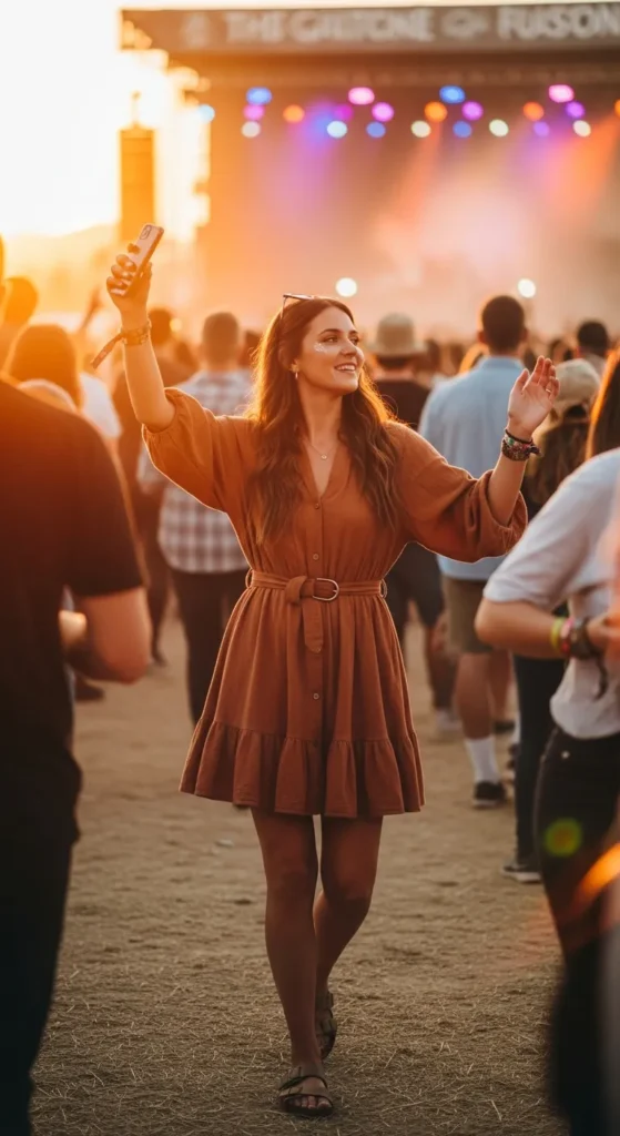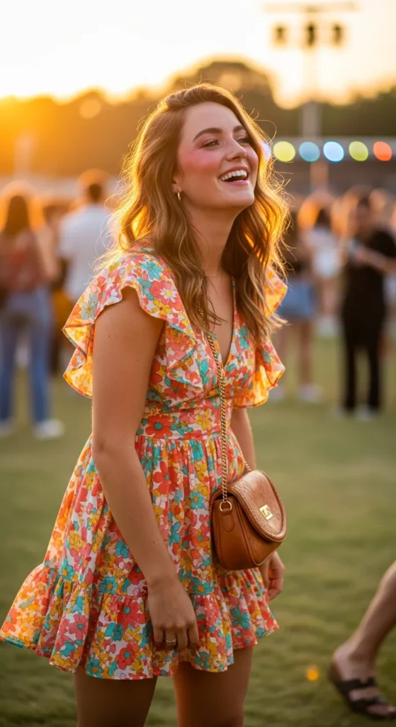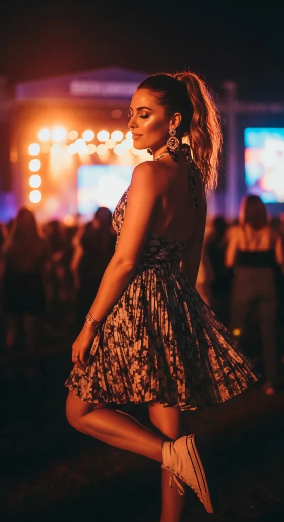 A flowy mini dress cinched at the waist creates a soft, flirty silhouette that feels carefree while still flattering under concert lights.