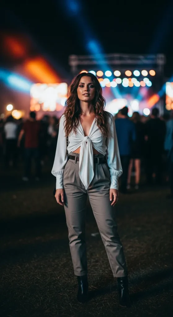 A tie-front blouse paired with high waist pants shows just enough skin while keeping things polished, making it perfect for concerts where you want flirty without fuss.