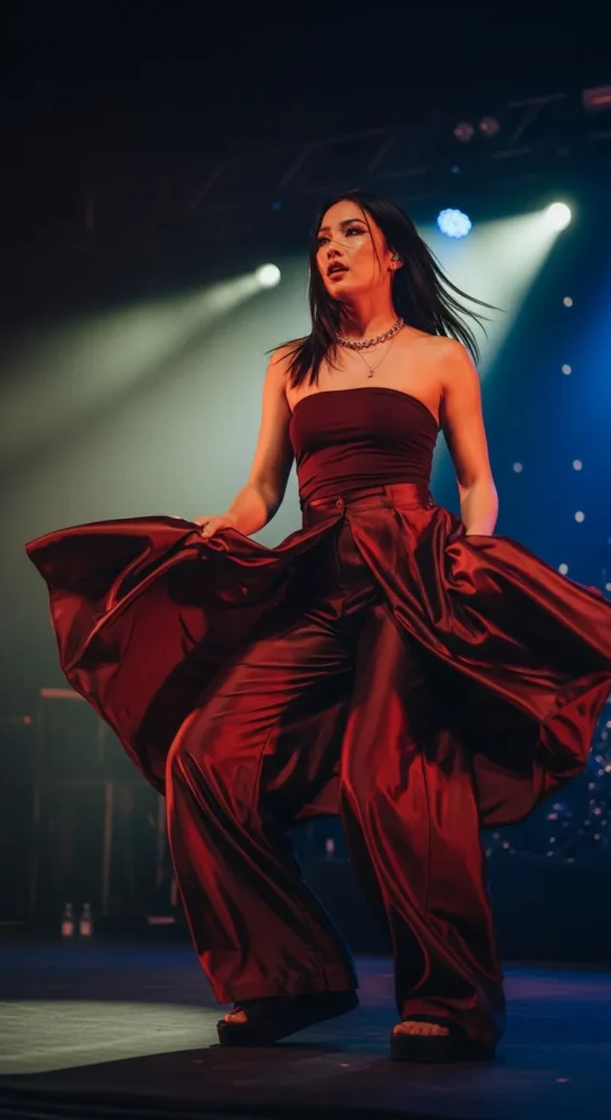 A tube top paired with wide-leg pants feels confident and breezy, giving a flattering silhouette that moves beautifully while keeping you comfortable in packed crowds.