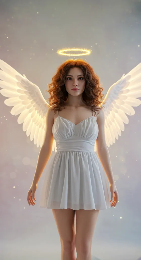 A flowy white mini dress paired with soft wings and a fluffy halo creates an effortlessly angelic look. Soft curls and light blush finish this heavenly vibe.