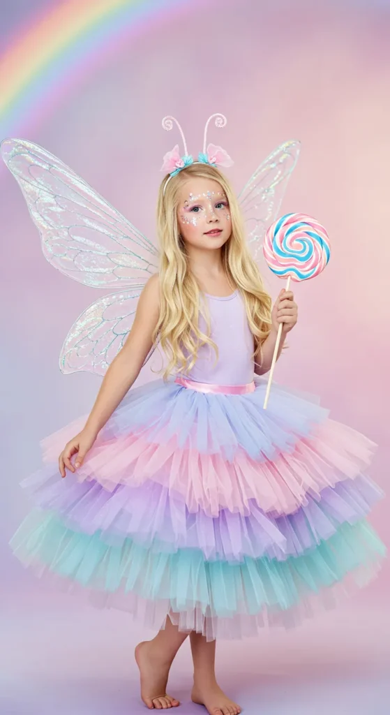 A pastel tulle skirt, sparkly wings, and glittery makeup create a whimsical candy-core outfit. Add a lollipop prop and glossy lips to make the whole look pop.