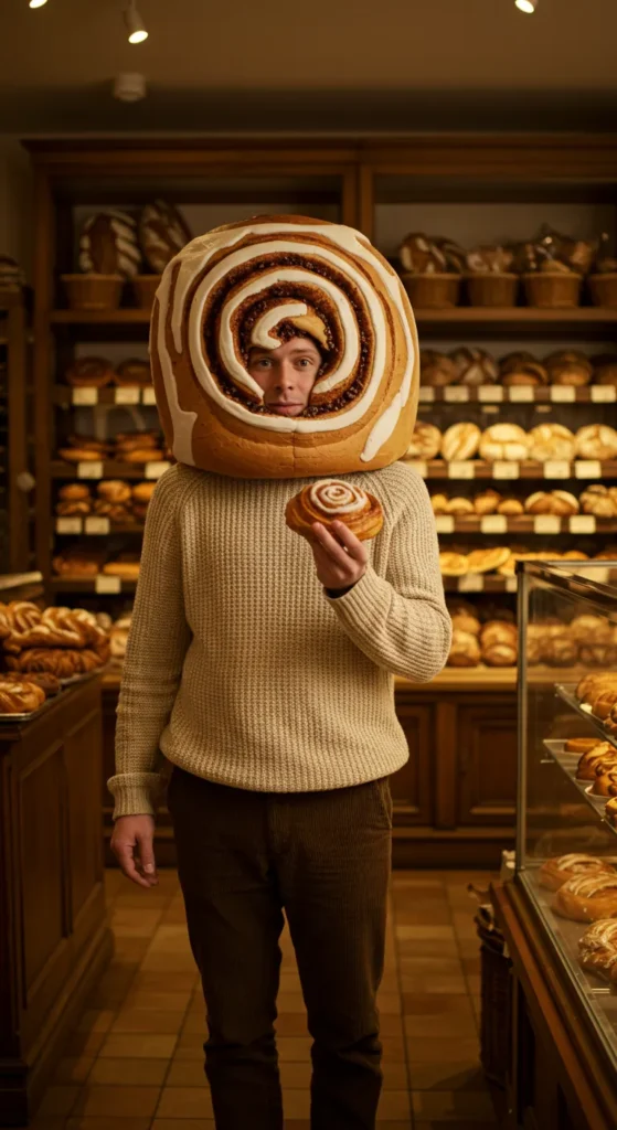 A cream knit sweater, brown corduroy pants, and soft warm-toned accessories give cozy bakery vibes. Add a little baguette or pastry prop for fun.