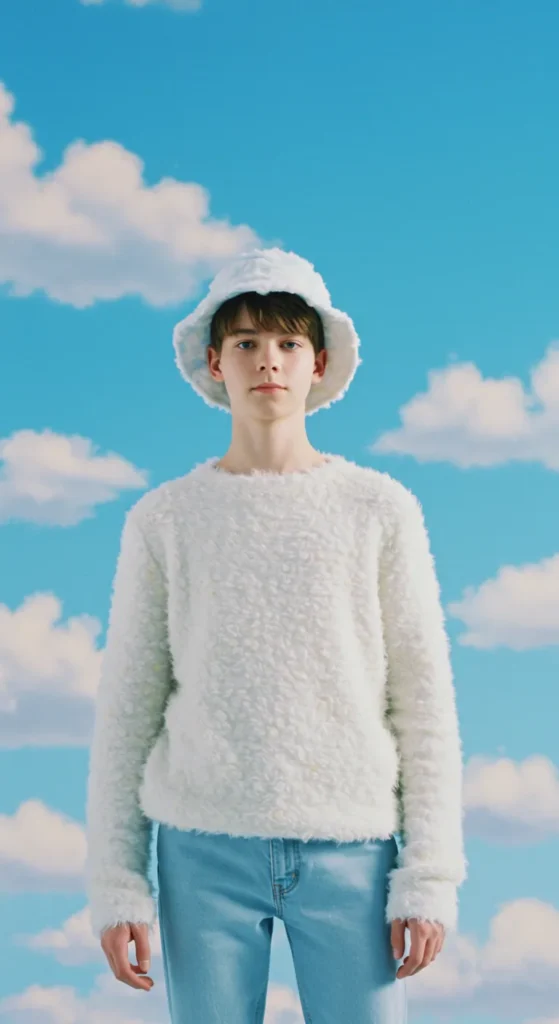 A fluffy white sweater, blue jeans, and a cloud-patterned bucket hat or headband create a soft sky-core aesthetic. Perfect for minimalists who still want something cute.