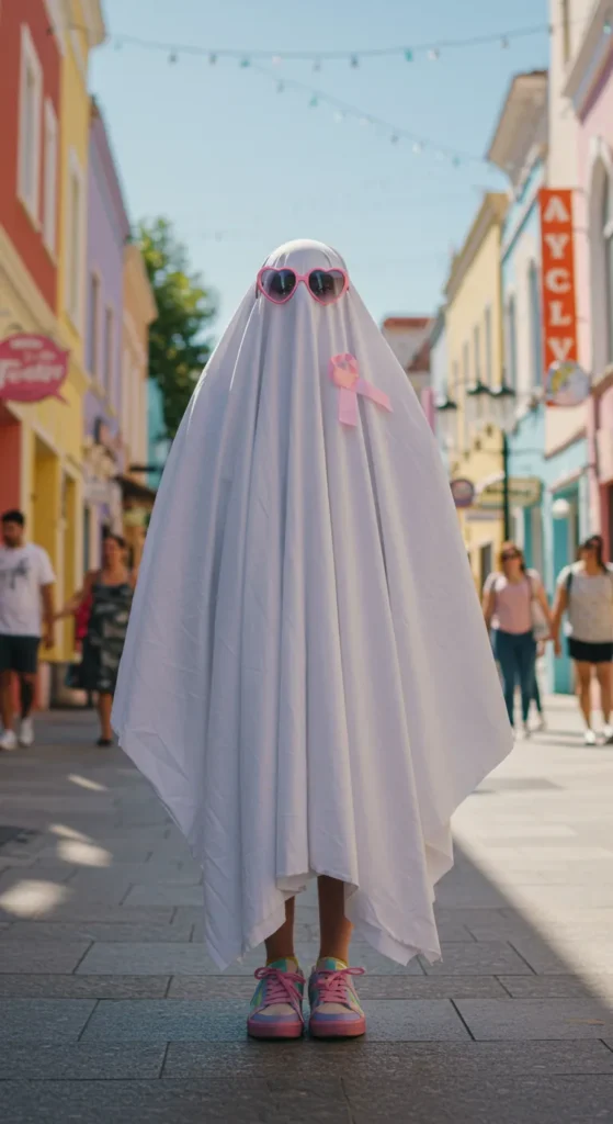 The classic white sheet ghost gets a cute glow-up with heart-shaped sunglasses, sneakers, and a pastel ribbon tied like a bow. Effortless and lovable.